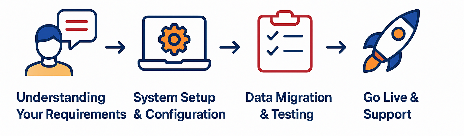 Our 4-step onboarding covers requirements gathering, system setup, data migration, testing, and smooth go-live with ongoing support.